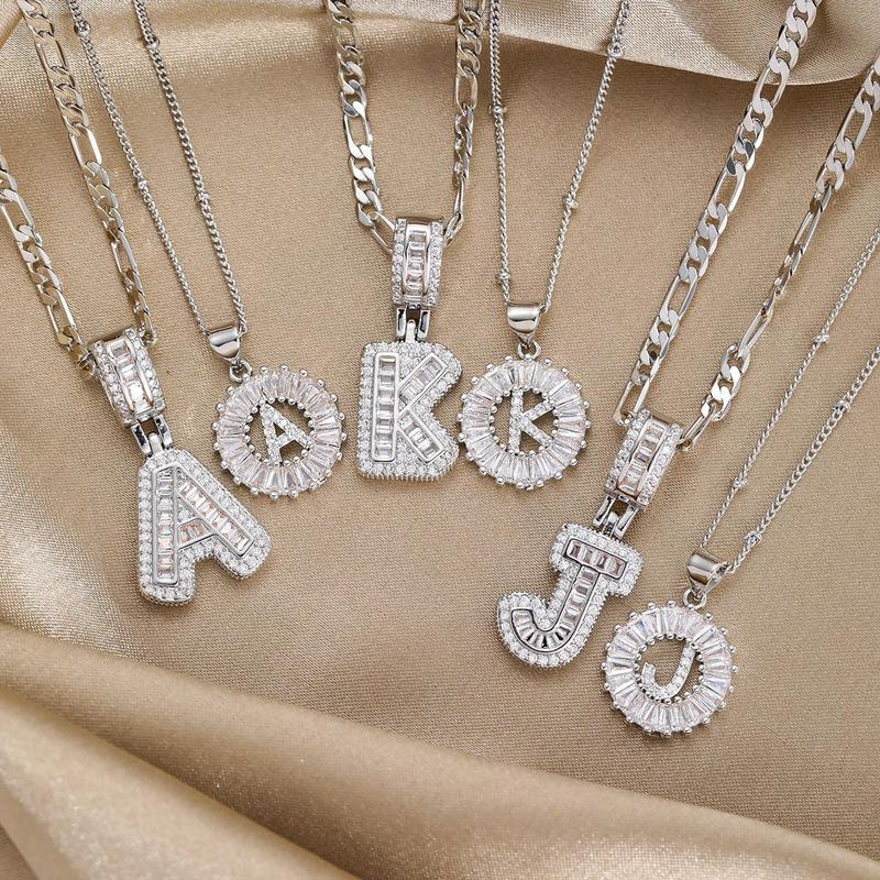 【B3】2 Count Initial Letter Necklace Set with Zirconia Stones | Golden/Silver Bubble Necklaces for Women | Iced Out Necklace for Men | Birthday Gifts Anniversary Gift | Letter Alphabet Necklace Zircon Stone Pendant Necklace Initial Zirconia Stone
